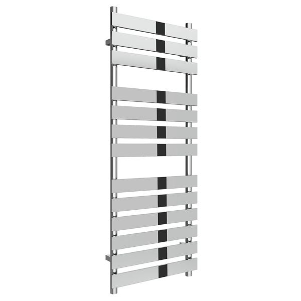 The Reina Trento chrome designer towel rail stands out with its contemporary appeal, featuring sleek rectangular bars that make it an excellent choice for modern bathrooms.
