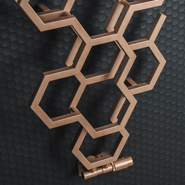 Improve your space with the Terma Hex bright copper designer radiator (1200 x 486mm). The Hex stands out with its unique hexagonal design, creating a bold statement piece for your room. It's not just a radiator, it's a work of art. The bright copper finish on the Hex radiator has a metallic, smooth texture and adds a touch of luxury, making the Hex an excellent choice for those seeking a distinctive designer radiator.